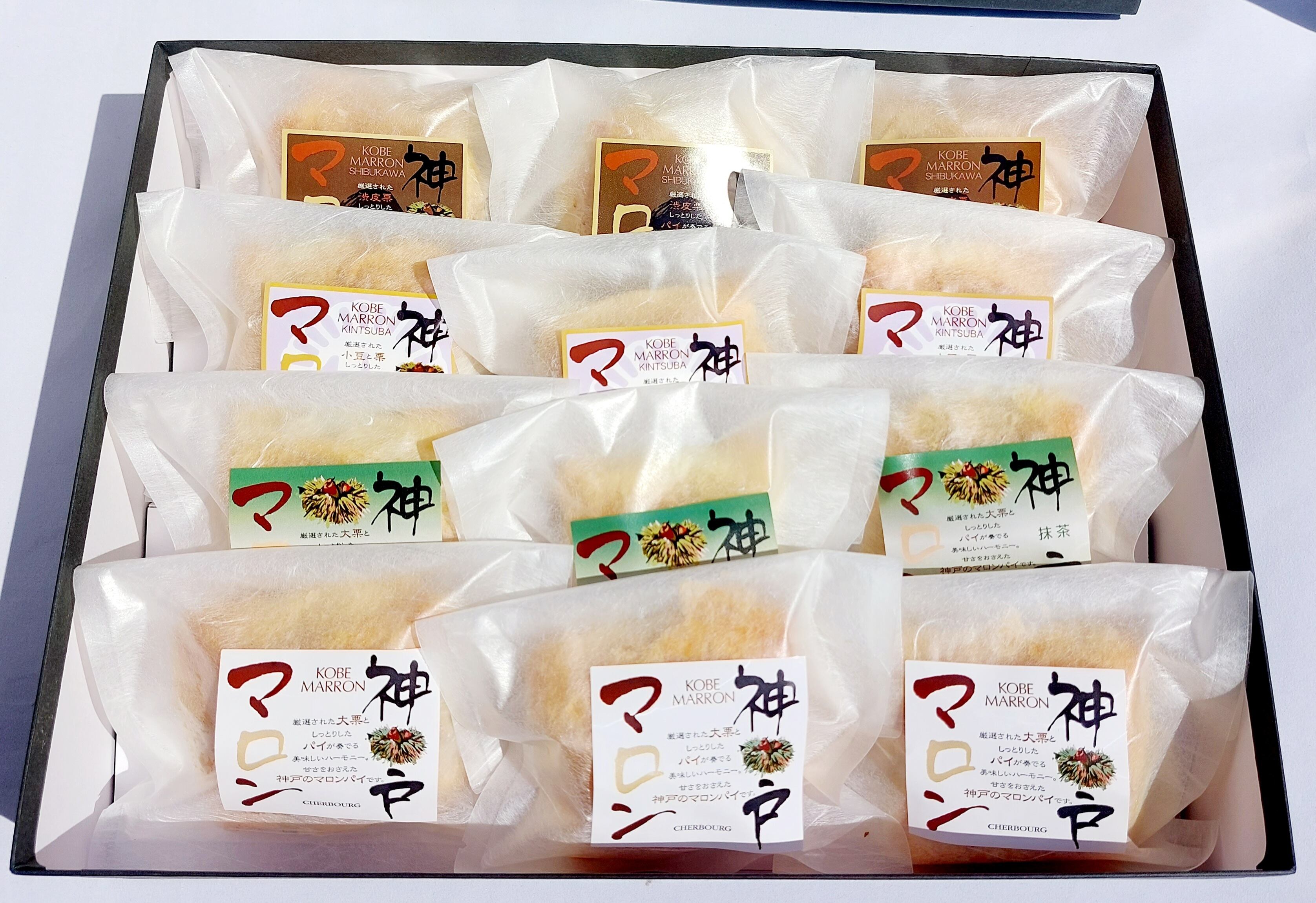 贈り物で人から人へ、贈られた人からおいしいと評価を受け、多くのお客様から支持されてきました。おかげさまで、月に10万個売れておりますが、今もなお、洋菓子の本場『神戸』の熟練パティシエが一つ一つ手作りしております。誕生日、内祝い、お返し、お見舞い、仏事、弔事などの贈り物に最適のマロン・抹茶・渋皮栗・きんつば各3個ずつの12個入りギフトセットです。