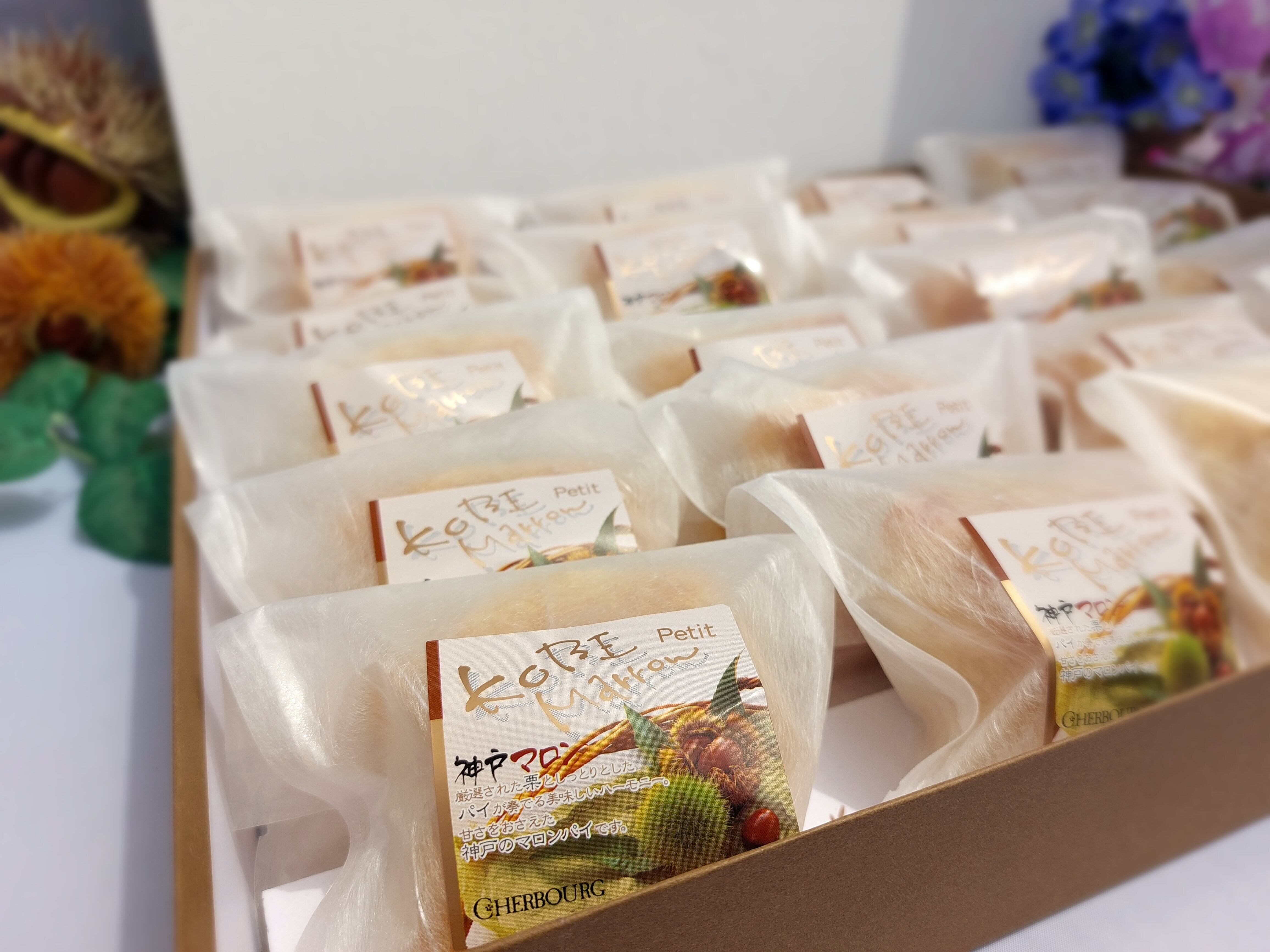 栗がまるごとひとつ入った当店の看板商品「神戸マロン」が小振りになったマロンパイです。 あらゆる品種の栗から厳選したほっこりした栗と、甘さを控えたマロン餡と長年かかって開発した特製のパイ生地とのハーモニーはやみつきになります。