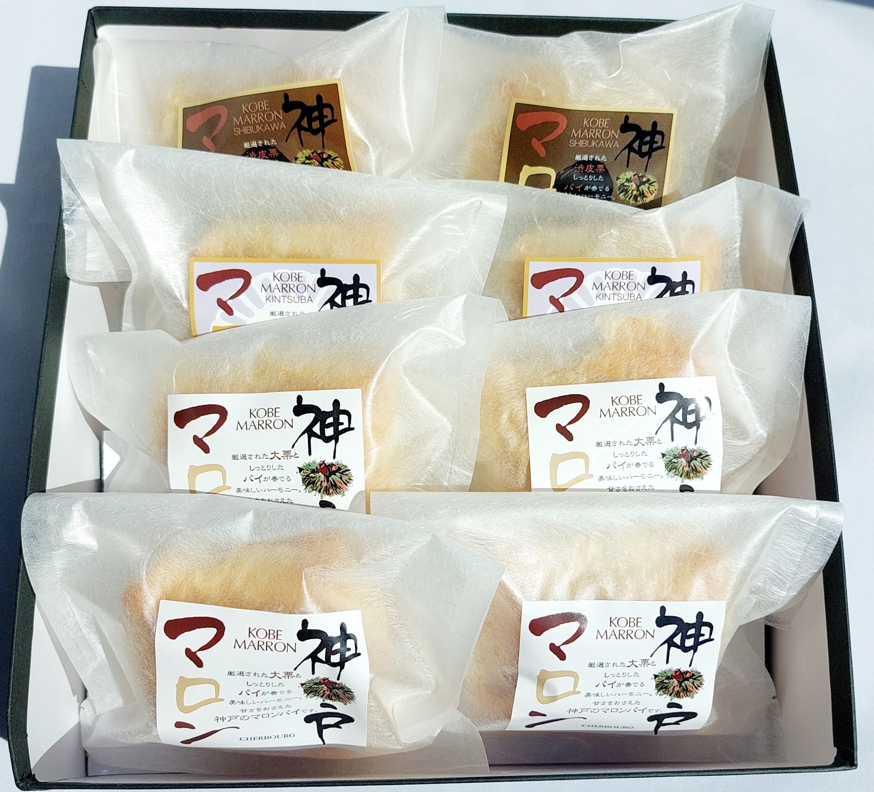 贈り物で人から人へ、贈られた人からおいしいと評価を受け、多くのお客様から支持されてきました。おかげさまで、月に10万個売れておりますが、今もなお、洋菓子の本場『神戸』の熟練パティシエが一つ一つ手作りしております。誕生日、内祝い、お返し、お見舞い、仏事、弔事などの贈り物に最適のマロン4つ、きんつば2つ、渋皮栗2つの8個入りギフトセットです。